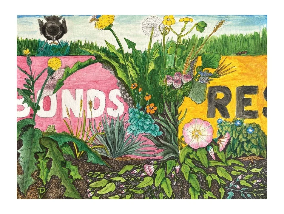 The artwork is: A Crack in C Yard’s Curb Taken Over by Nature, 2025 by Timothy, watercolor and ink. Courtesy of Prison Arts Collective. From the artist: The curb reads ‘Out of Bounds and Restricted Area’. This is a symbol of the fact that everything man makes is transitory, but nature left alone regenerates itself.